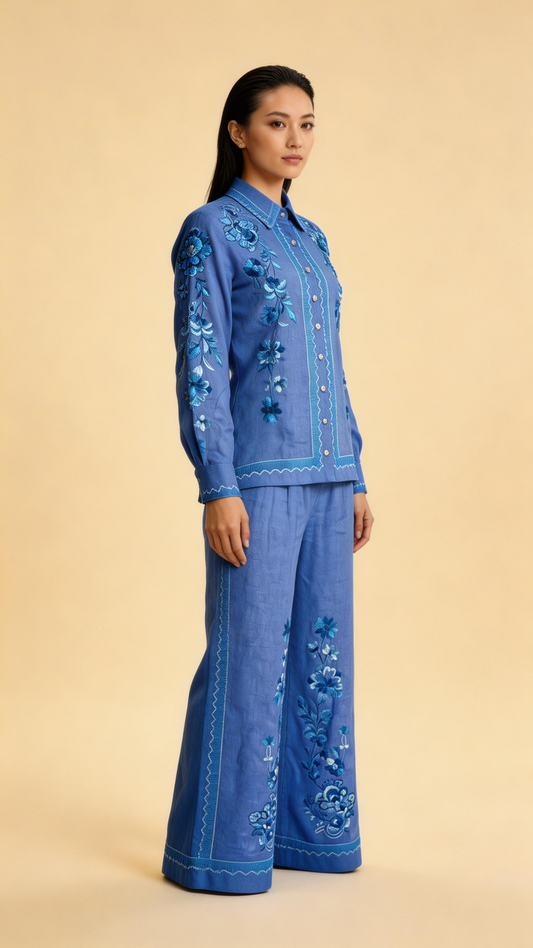 Azure Bloom Embroidered Linen Co-ord Set