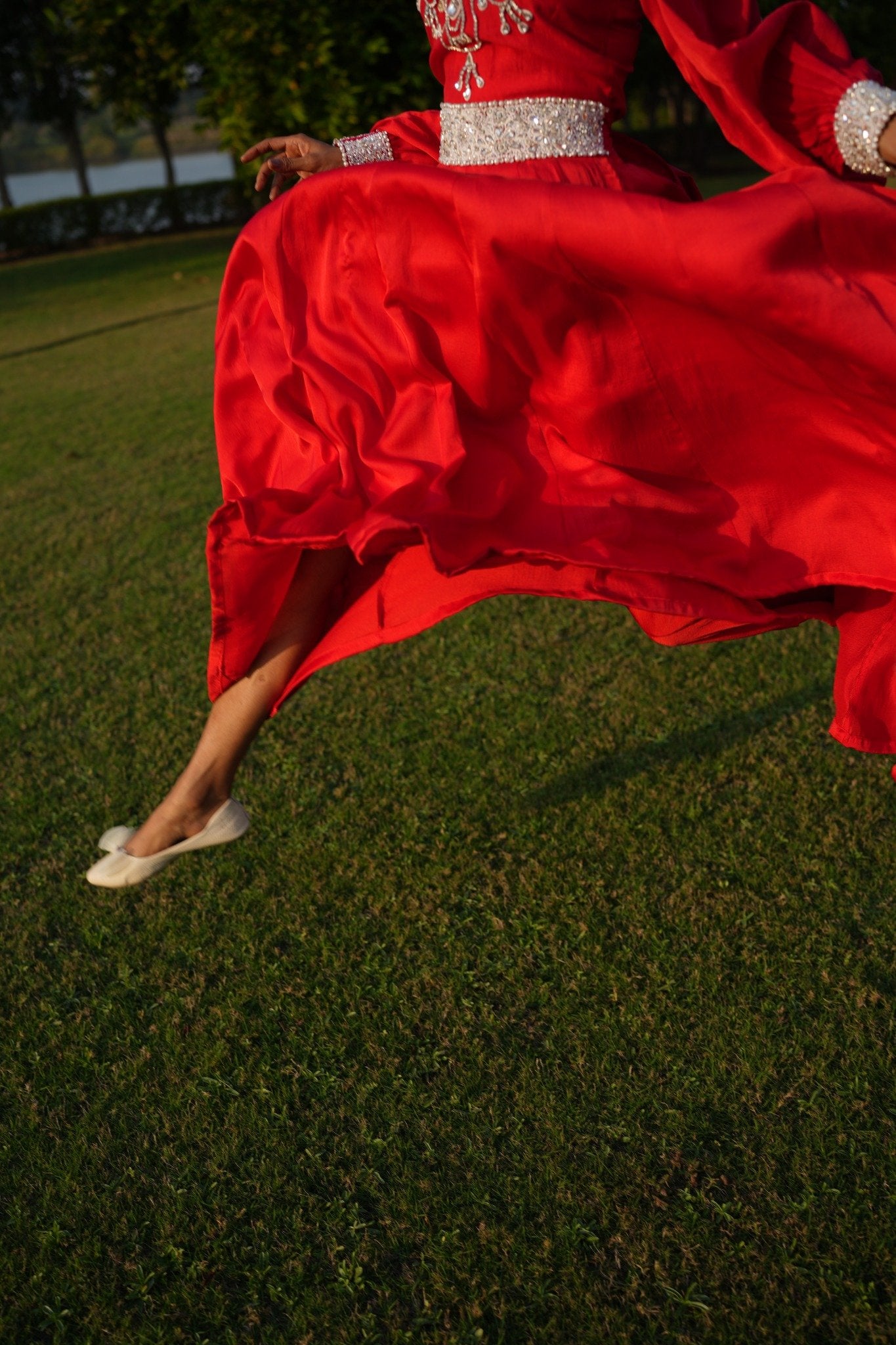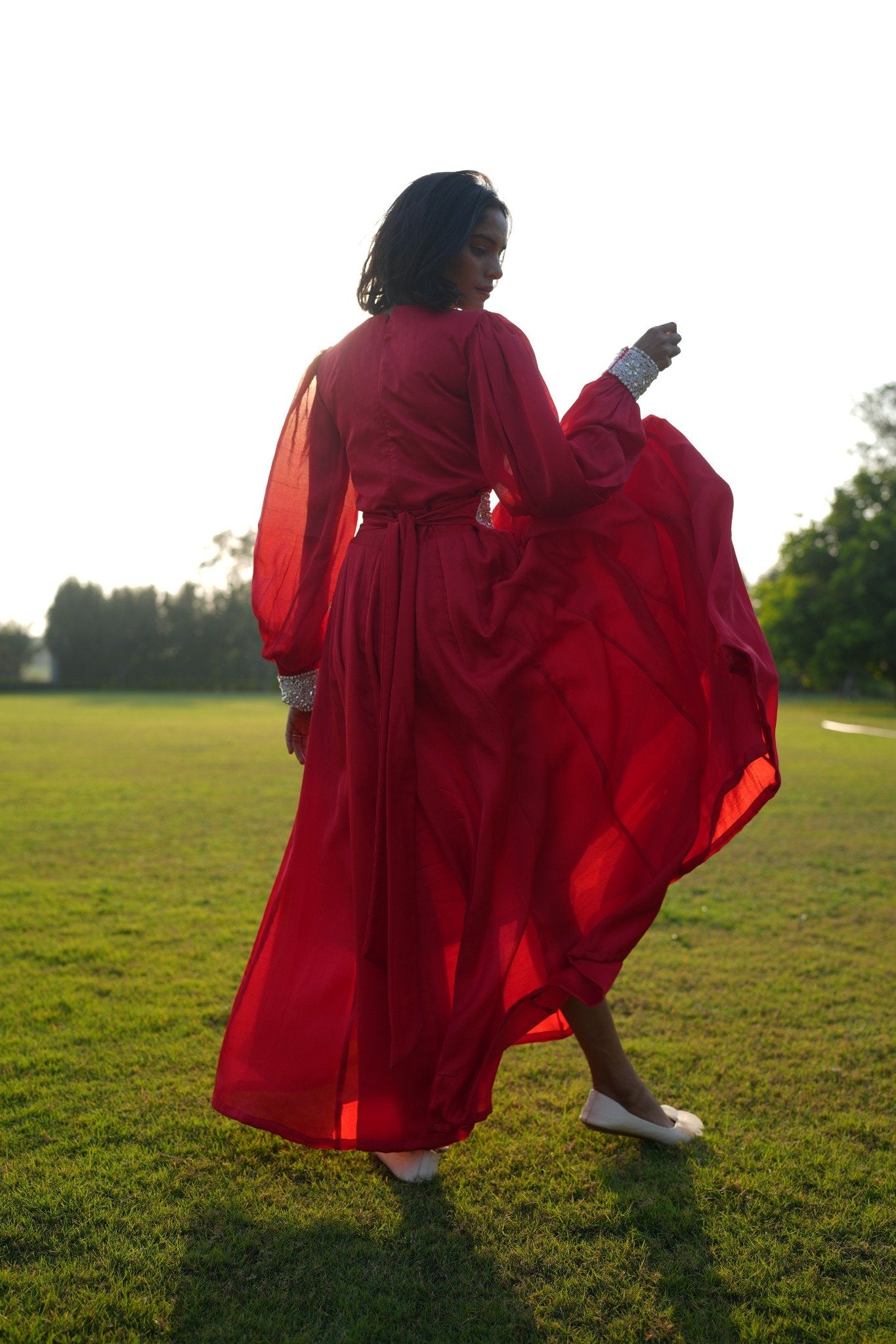 Color & Print: A captivating blend of deep red hues with intricate prints that add an artistic, timeless appeal.